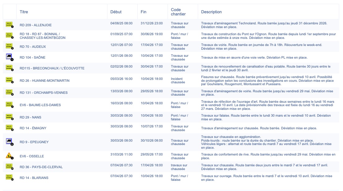 Les perturbations majeures sur le réseau départemental sont consultables sur Le site d’information du Département www.inforoute25.fr