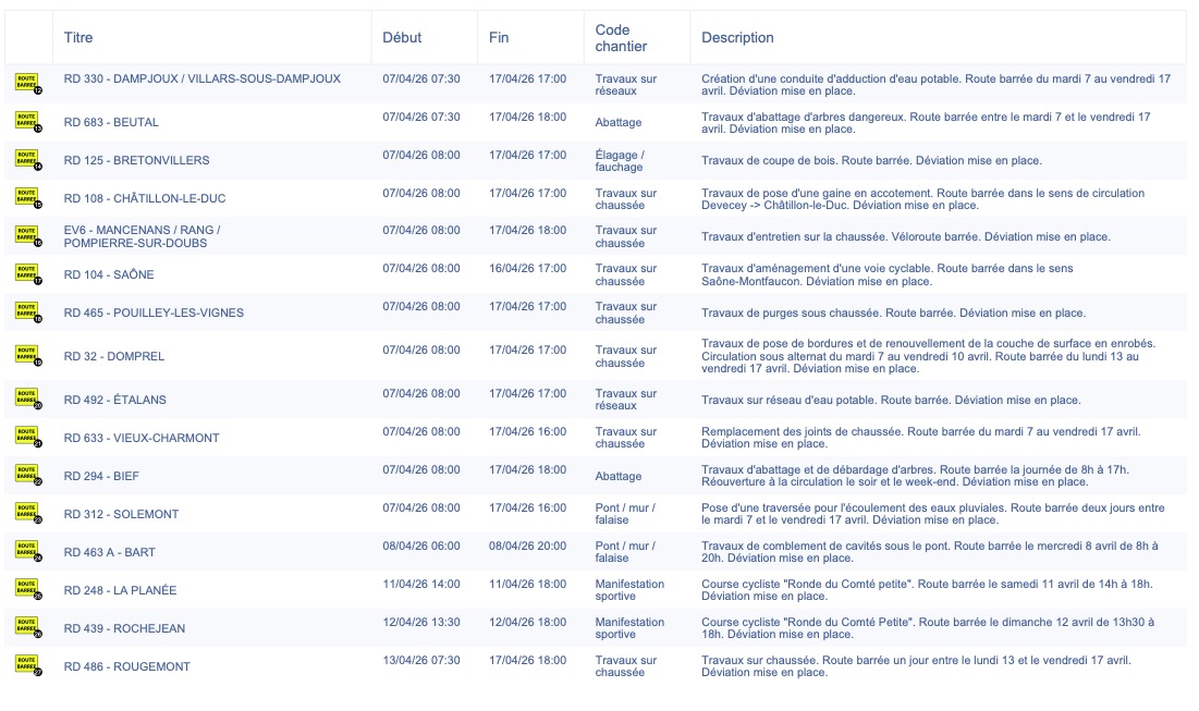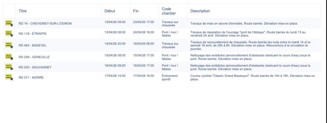 Voici les travaux qui se dérouleront du lundi 6 au vendredi 10 avril 2026 sur les routes du département du Doubs.