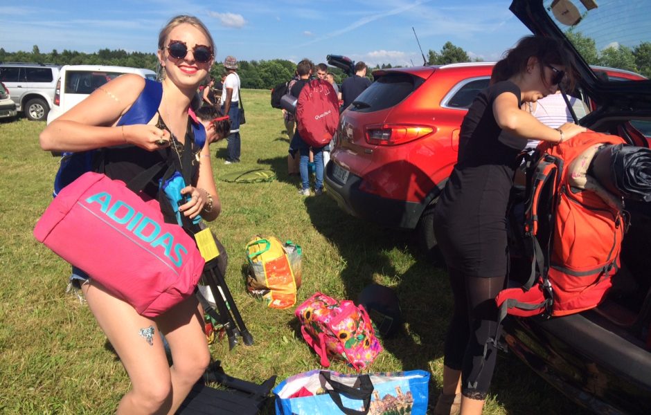 16h00 : Top départ pour les quatre festivalières, Lisa, Camille, Mélina et Vic ! On a déjà chaud, mais on est bouillantes pour mettre le feu ce week-end ! Un peu serrées dans la voiture. Difficile de se rendre compte que les affaires sont empilées partout autour de nous !