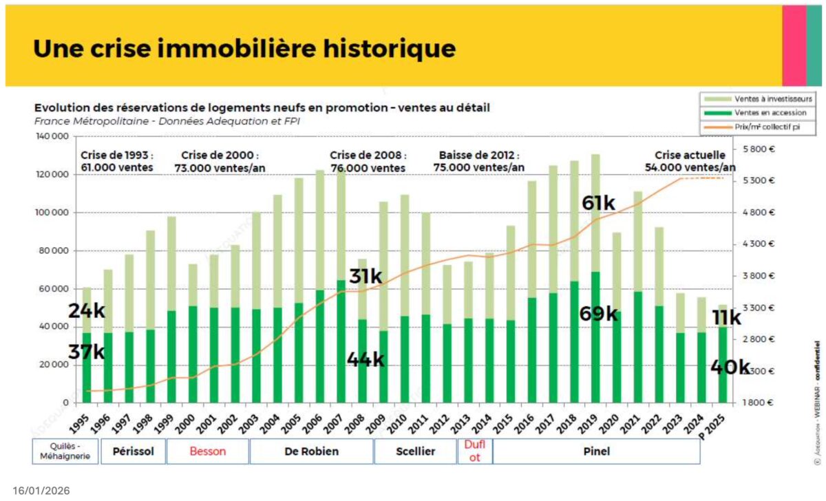 En France, à l’échelle nationale, l’Observatoire de l’immobilier de la Fédération des promoteurs Immobiliers (FPI) dresse le constat d’un cycle baissier. Le document fait état d’une ”baisse historique des ventes”, accompagnée d’un ”recul des ouvertures de chantier” et d’une ”diminution des mises en vente”.