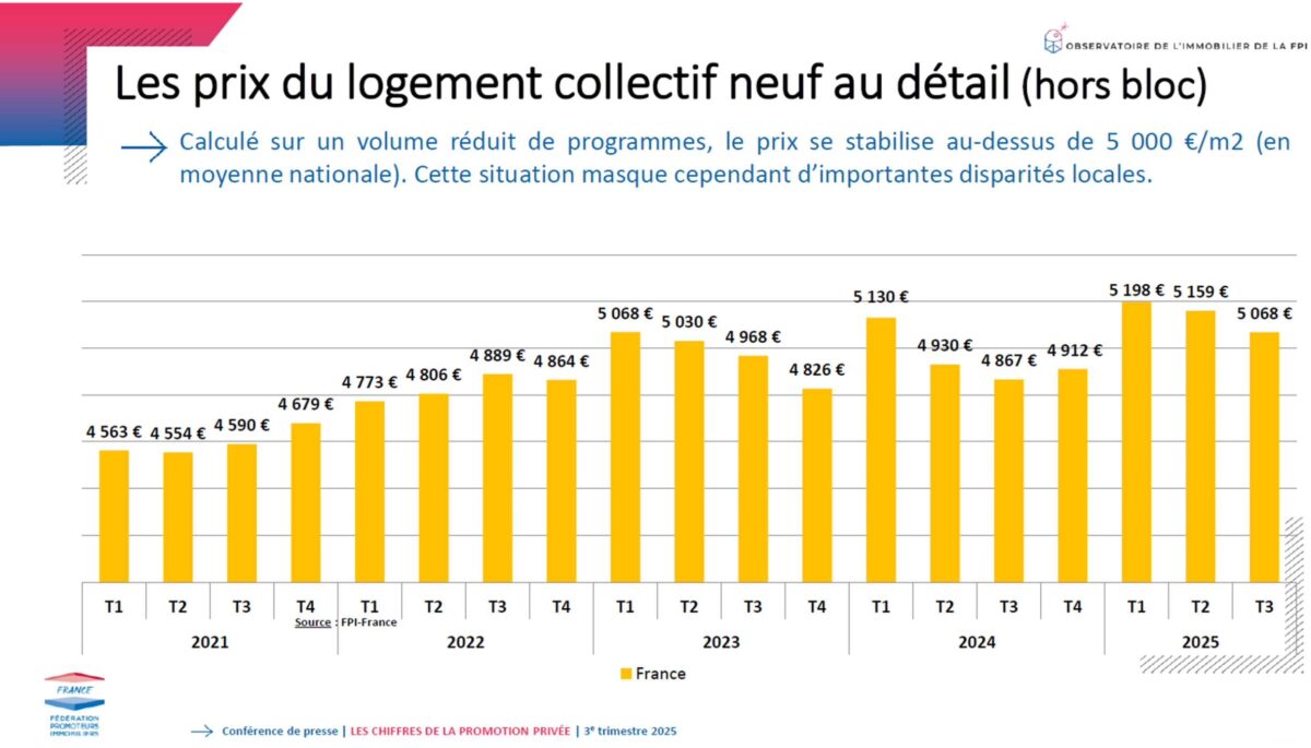 Sur le plan des prix, la stabilité prévaut. ”Les prix ne baissent pas”, indique Fabrice Jeannot, en raison ”de la hausse des coûts de construction, du renforcement des normes, et d’un prix de foncier qui reste très élevé et rare”. Les prix moyens nationaux se situent autour de 5 000 euros TTC par mètre carré.