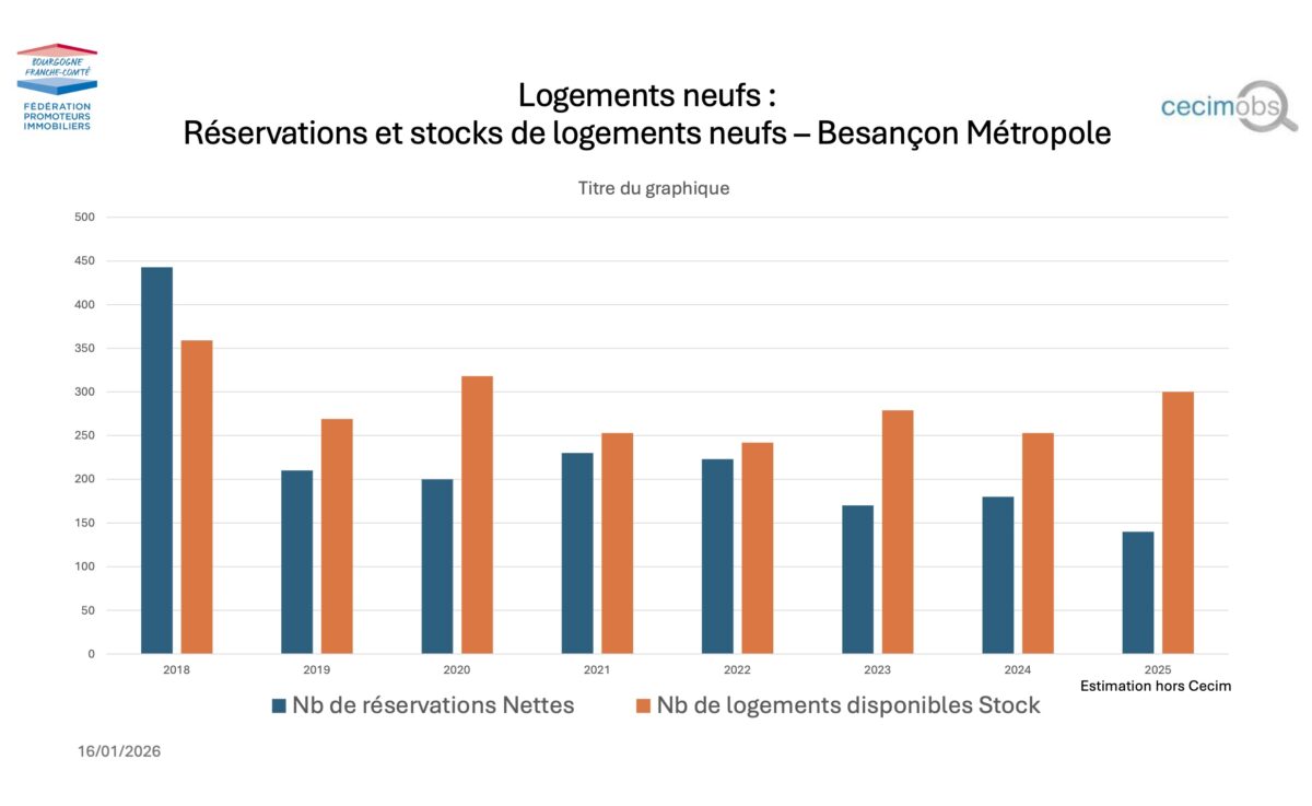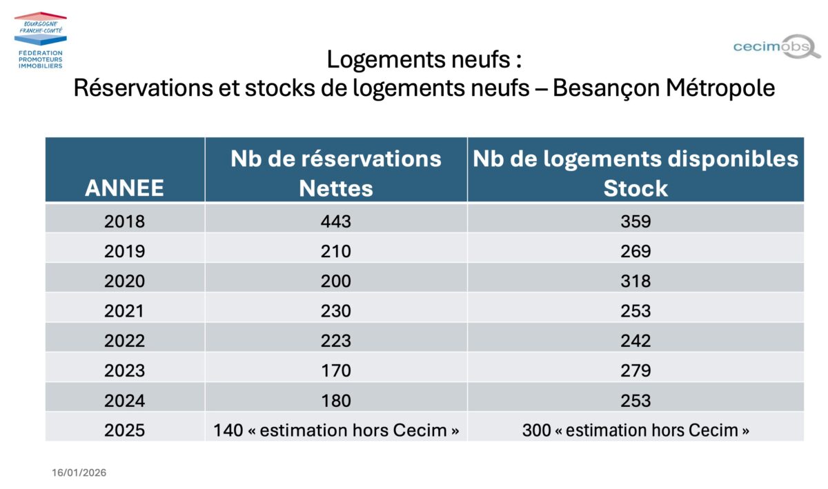 Localement, Besançon s’inscrit dans cette tendance nationale, avec une contraction des ventes de logements neufs en 2025. Le nombre de réservations nettes est estimé à 140 logements, soit un ”niveau jamais aussi bas”, selon le vice-président.
