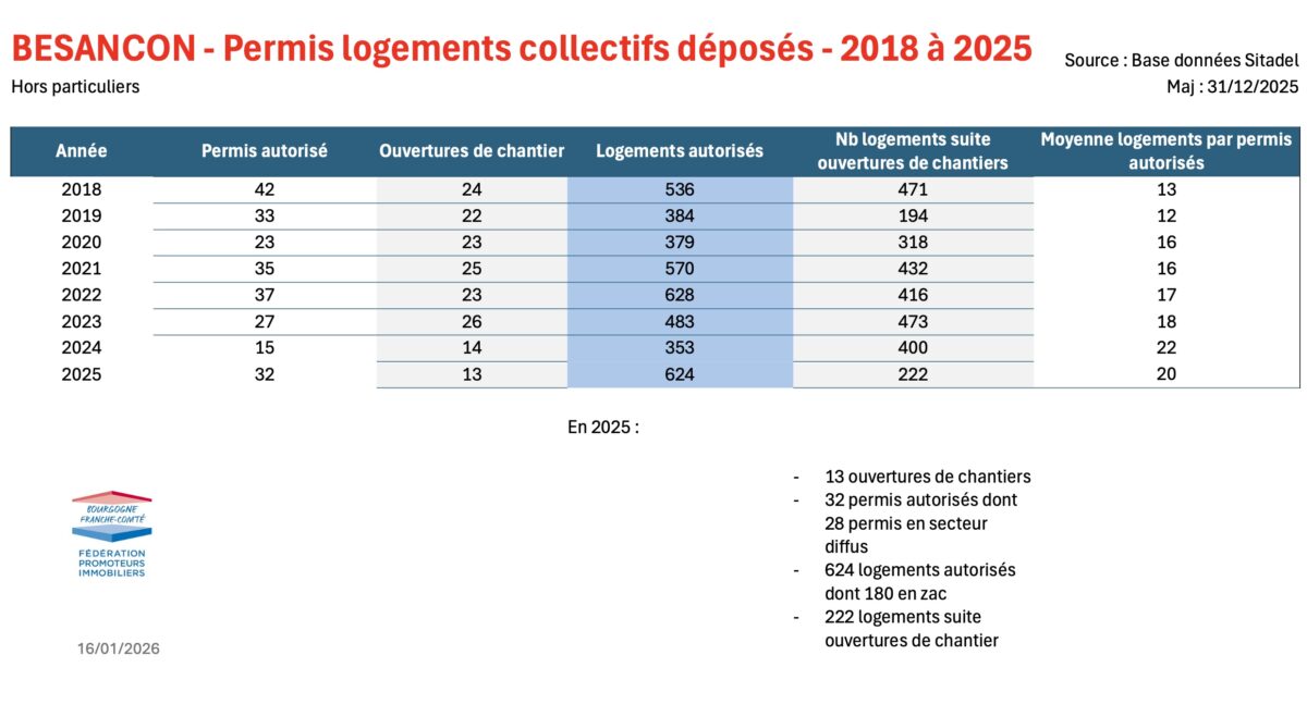 Contrairement à la baisse des ventes, la production de permis de construire progresse à Besançon. En 2025, 32 permis ont été autorisés, correspondant à une moyenne haute depuis 2018. Ces autorisations représentent 624 logements, dont 180 en zone d’aménagement concerté.