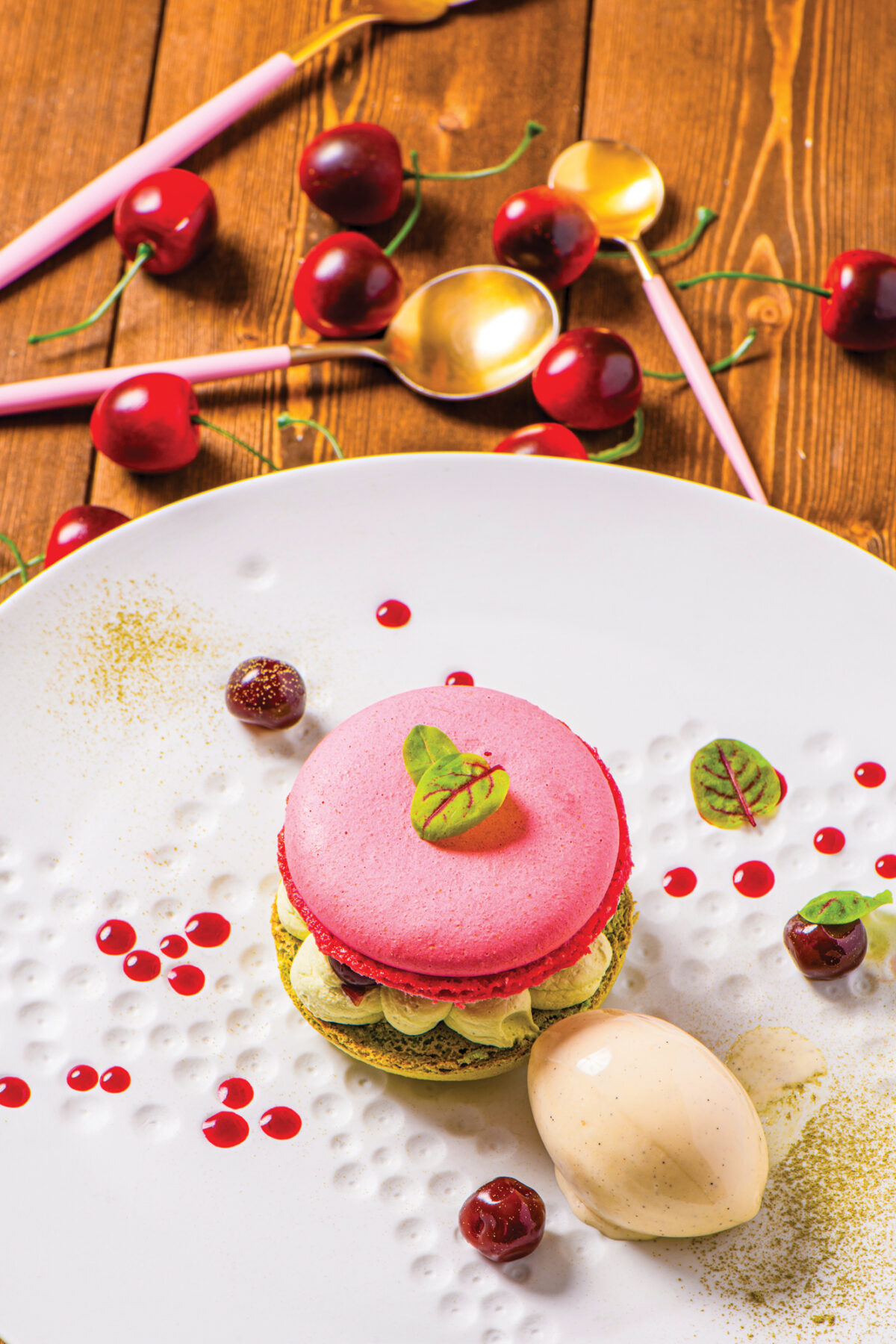 7 Dressage. Déposez un macaron bicolore au centre de l’assiette. Ajoutez une quenelle de crème glacée vanille, quelques éclats de chips à la framboise. Décorez avec quelques fruits frais, herbes ou éclats de pistache.