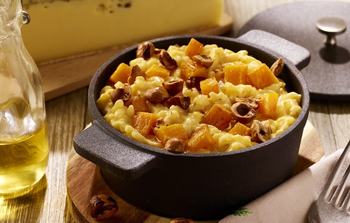 - Quand le riz est cuit, ajouter la purée de courge et le Morbier. Bien mélanger.