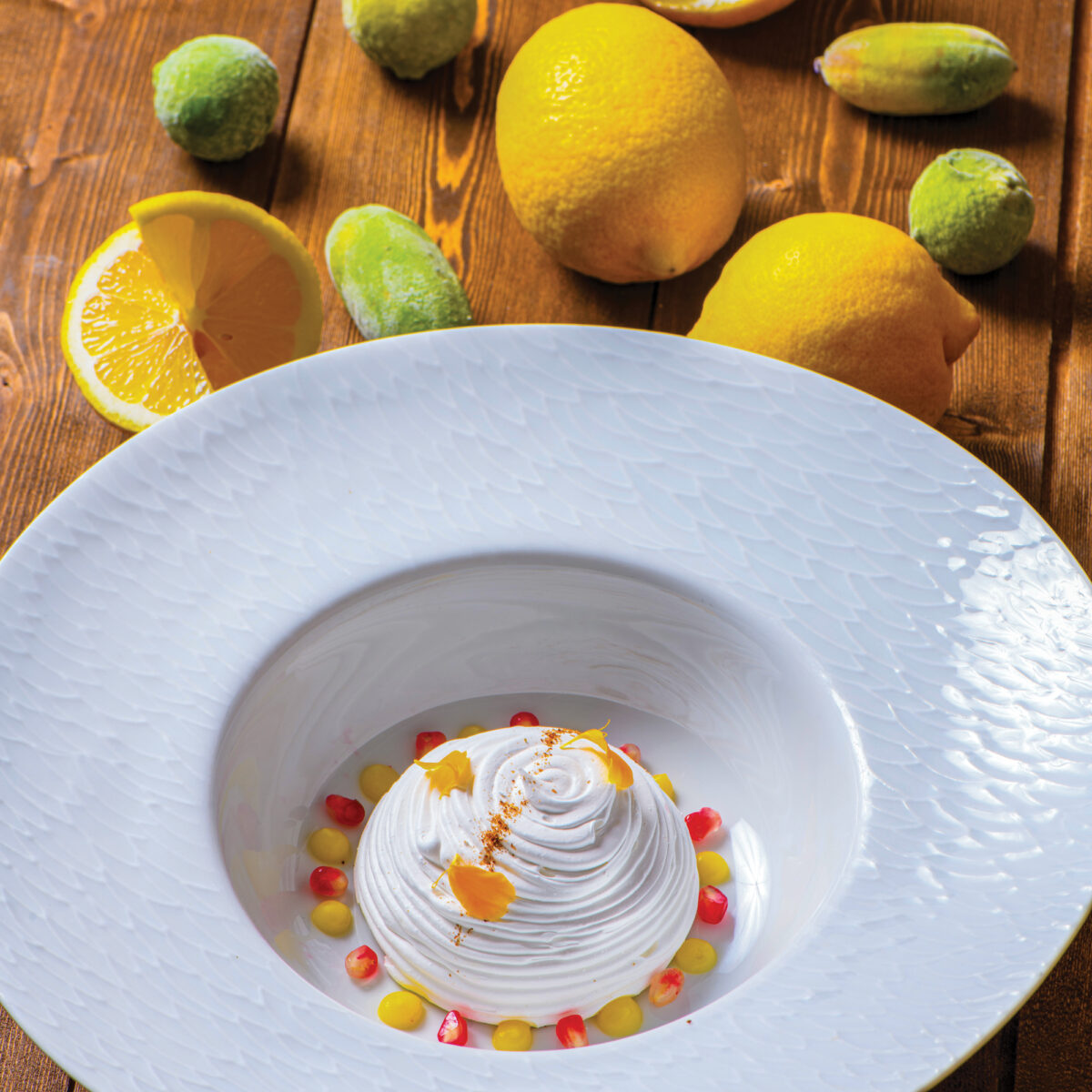 Déposez un dôme de meringue sur chaque assiette. Garnissez le cœur de la coque d’une généreuse rosace de ganache vanille et chocolat blanc. Disposez autour et sur la ganache les fruits exotiques en différentes textures, alternez couleurs et formes. Ajoutez quelques zestes confits, herbes fraîches et zestes d’agrumes. Déposez une quenelle de sorbet juste avant de servir aussitôt.