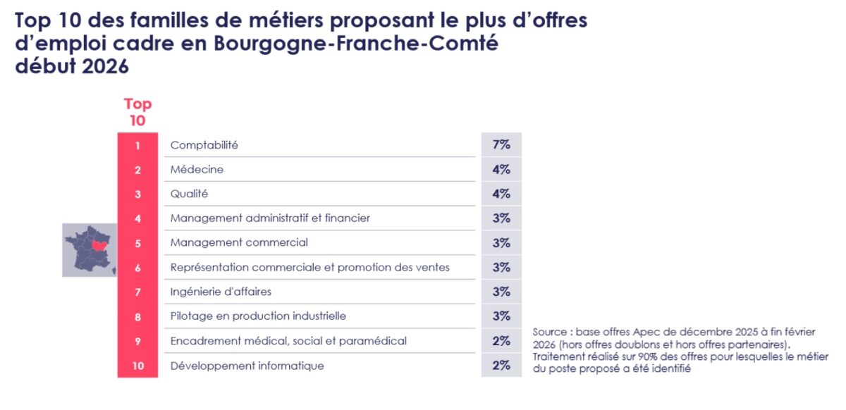Malgré cette baisse des recrutements, les effectifs de cadres continuent d’augmenter. En France, ils progressent de 1,5 %, contrairement à l’ensemble de l’emploi salarié privé. En Bourgogne-Franche-Comté, cette dynamique se traduit par 1 230 créations nettes de postes cadres en 2025, bien qu’en recul par rapport à 2024 (1.740 créations).