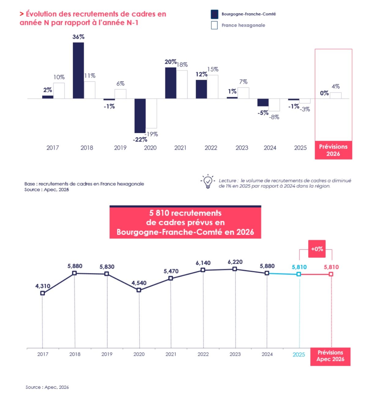 En 2025, la Bourgogne-Franche-Comté a enregistré 5.810 recrutements de cadres, soit une baisse de 1 % par rapport à l’année précédente. Ce recul s’inscrit dans une tendance nationale, mais reste plus limité à l’échelle régionale. Hervé Reynier, délégué régional de l’Apec Bourgogne - Franche-Comté, souligne que l'année dernière, le marché de l’emploi cadre en Bourgogne-Franche-Comté a subi "une baisse moins marquée qu’au niveau national, liée notamment aux difficultés de l’industrie dans la région, en particulier la mécanique et la métallurgie. Un niveau similaire est attendu en 2026, encore éloigné du record de 2023, dans un contexte incertain.”