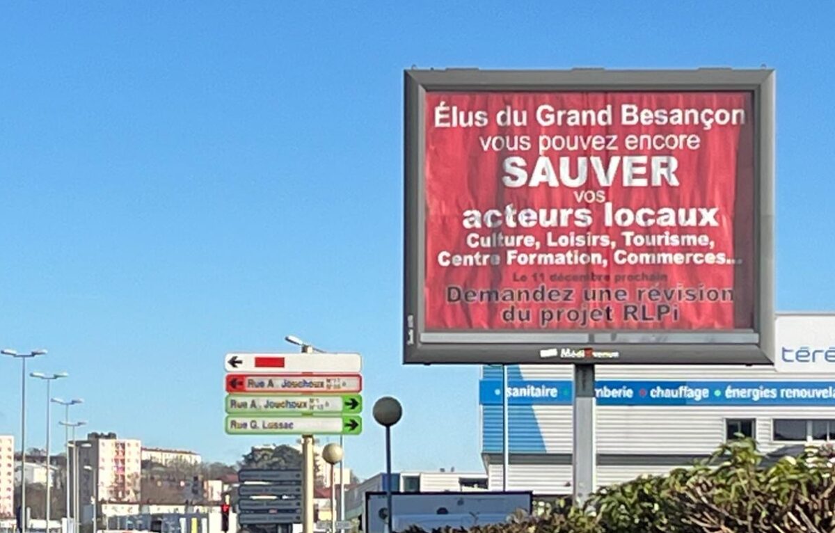 En amont du vote du 11 décembre, les afficheurs locaux ont adressé un courrier aux 200 élus de Grand Besançon Métropole, intitulé “Projet de RLPi – Préservons ensemble l’équilibre local et l’économie de proximité” rappelant et réunissant toutes les inquiétudes et propositions. Ils y affirment alerter depuis plusieurs mois sur “les conséquences du futur Règlement Local de Publicité intercommunal (RLPi)” et regrettent qu’“aucune de nos recommandations ou propositions d’aménagement n’a été entendue”.