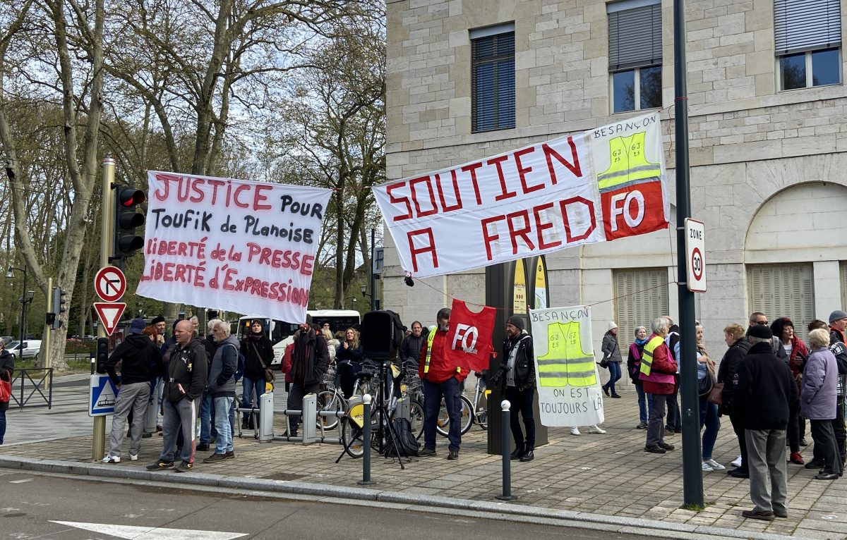 Une bannière en soutien au journaliste Toufik de Planoise, convoqué pour les mêmes raisons que Frédéric Vuillaume, a également été déployée pour réaffirmer "la liberté de la presse".