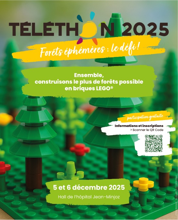 Le défi consiste à construire le plus de fôrets possibles en briques LEGO en 14h00. Il est possible de participer le 5 ou le 6 décembre 2025 sur inscription au CHU de Besançon.
