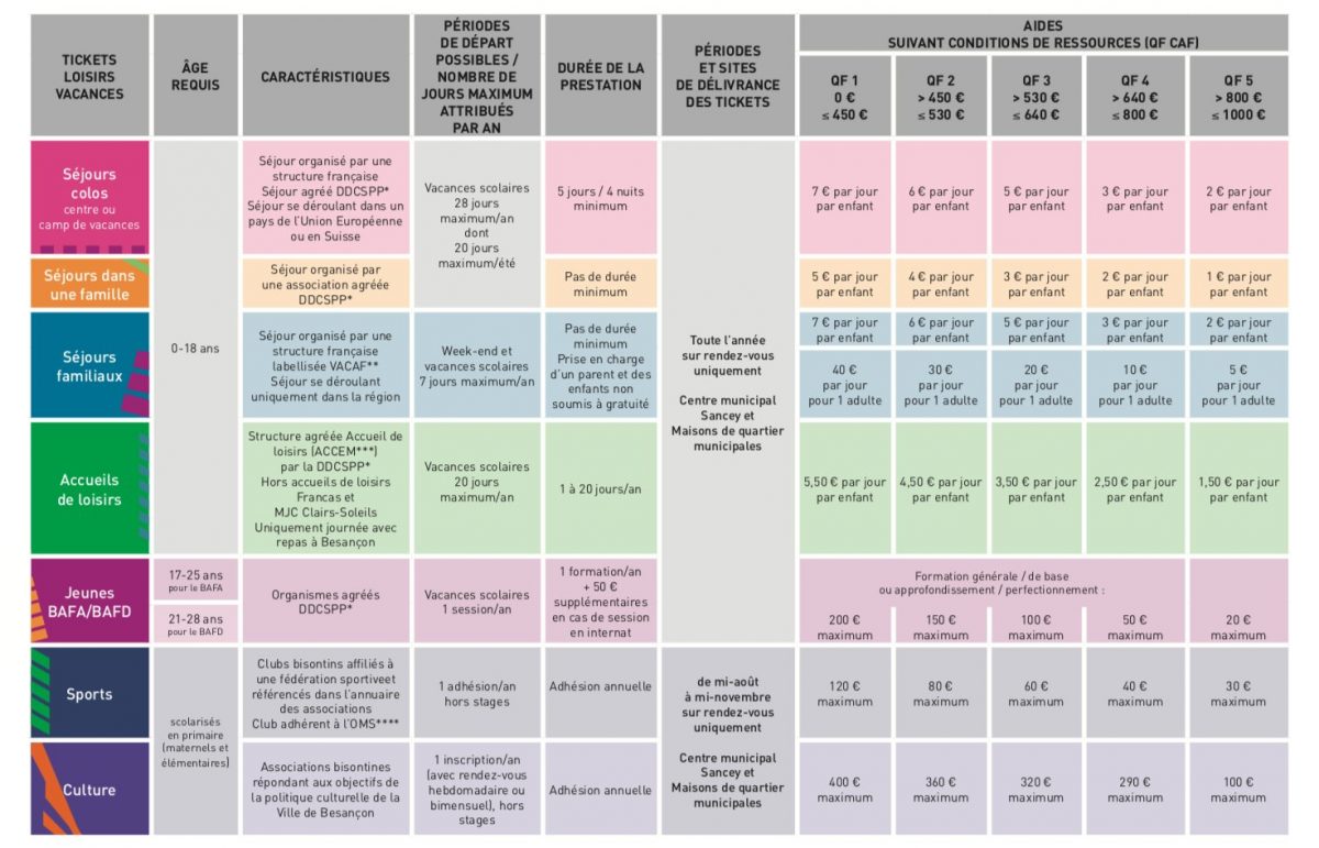 Ce dispositif, qui s’adresse aux Bisontins disposant de revenus modestes, regroupe différentes aides financières délivrées sous conditions de ressources et permettant de lutter contre les inégalités d’accès des enfants, des jeunes et des familles aux loisirs sportifs, socio-culturels et éducatifs sur les périodes de vacances et de temps extrascolaires.