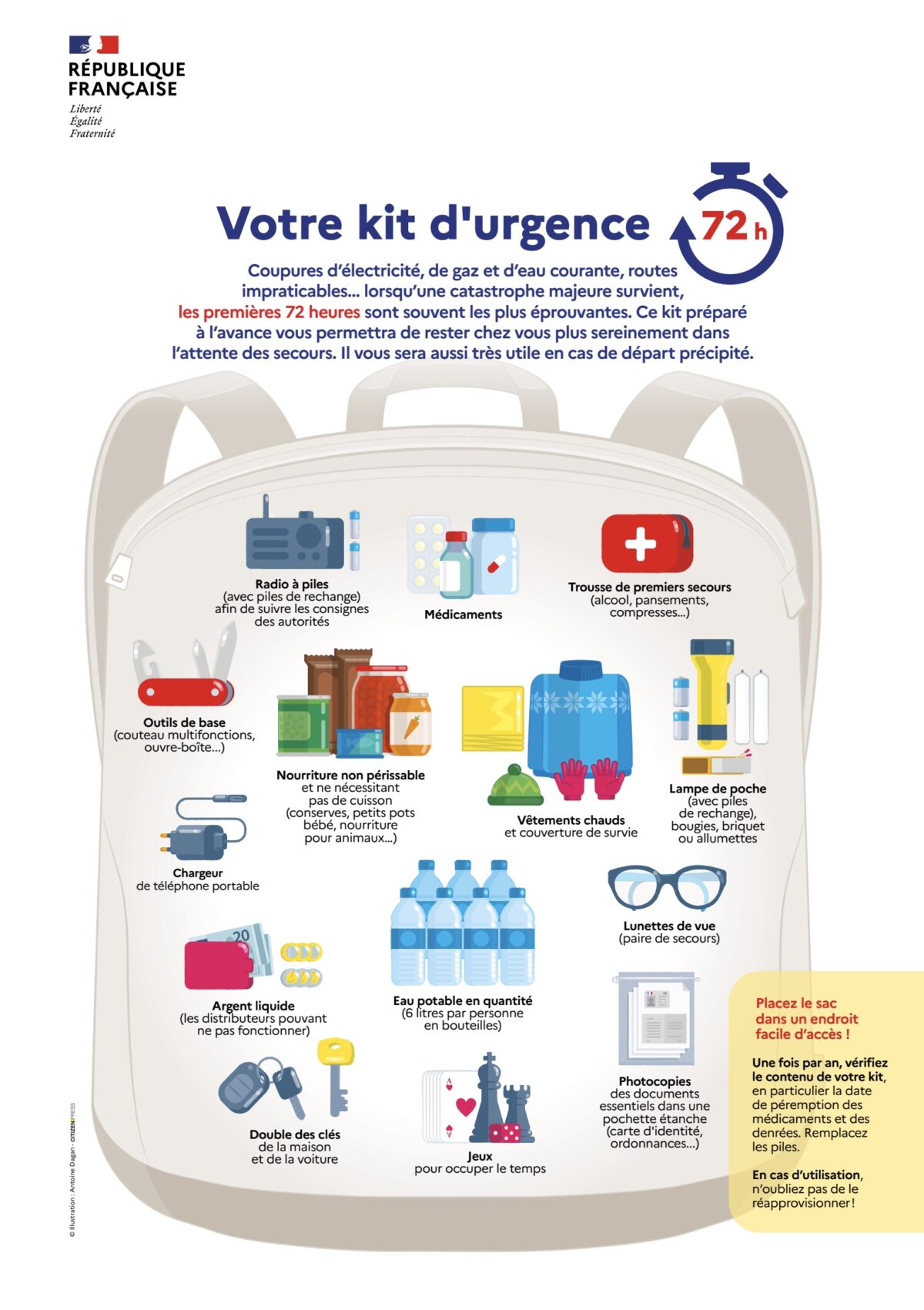 Ce guide se veut avant tout pragmatique. Il ne s’agit pas d’un manuel militaire, mais d’un ensemble de conseils simples à appliquer au quotidien. Le gouvernement y encourage notamment les foyers à constituer un kit d’urgence comprenant eau potable (six litres par personne) produits alimentaires non périssables, lait infantile si nécessaire, nourriture pour animaux, trousse de premiers secours, lunettes de vue de secours, lampe torche, chargeur de téléphone, argent liquide, radio à piles...