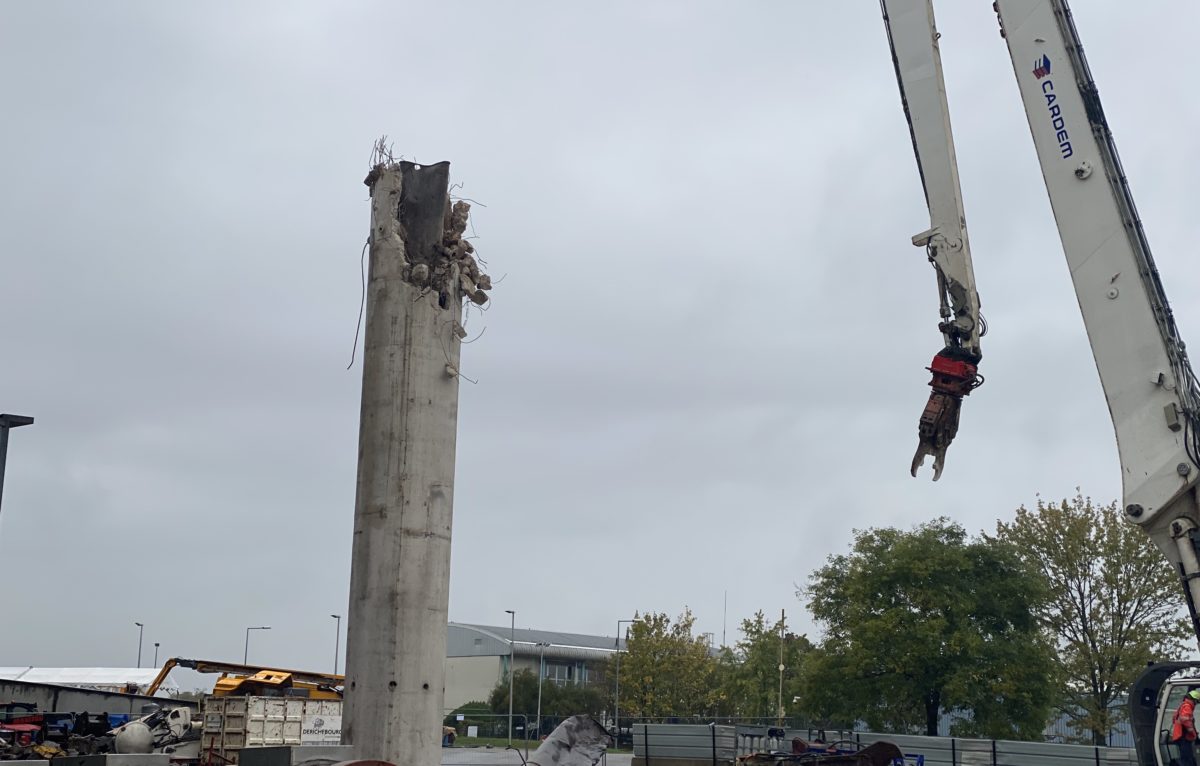Pour démanteler une aussi grande dame, une pelle à grande bras de 43 mètres de haut est en ce moment-même à l’oeuvre pour la grignoter de haut en bas.