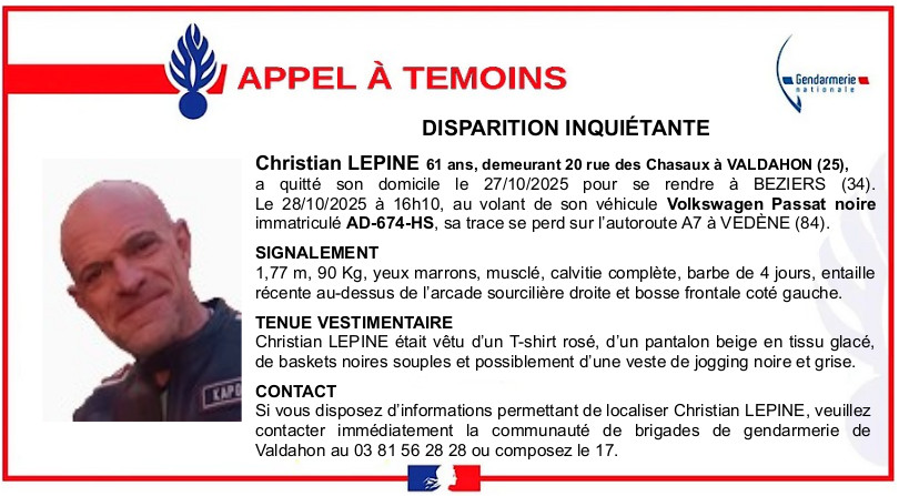 "A la demande de la famille et avec l'accord du Procureur de la République de Besançon, les gendarmes de la communauté de brigades de Valdahon en charge de l'enquête judiciaire relative à la disparition de monsieur Christian L., invitent toute personne permettant de localiser ou de contacter cette personne à se mettre en rapport avec eux", peut-on lire sur l’alerte donnée sur la page Facebook de la gendarmerie du Doubs.