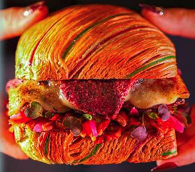 "Le Maraîcher est mon burger moderne et audacieux, reconnaissable à sa forme carrée, du bun feuilleté jusqu’au montage final. Je marie un steak de bœuf herbacé à une généreuse palette de légumes, en particulier la carotte, que je travaille sous différentes formes pour apporter douceur et fraîcheur. J’ajoute la tomme du Jura fumée au sapin, la mousseline de carotte rôtie aux épices et le gratiné de morilles pour la gourmandise. J’équilibre l’ensemble avec des pickles de carottes et d’oignons rouges. La sphérification de tomates confites et la croûte de betterave à la pécan torréfiée apportent ma touche originale et contemporaine. Le Maraîcher propose ainsi une vision sobre et engagée du Burger du Futur, où innovation, végétal et gourmandise coexistent sans excès".