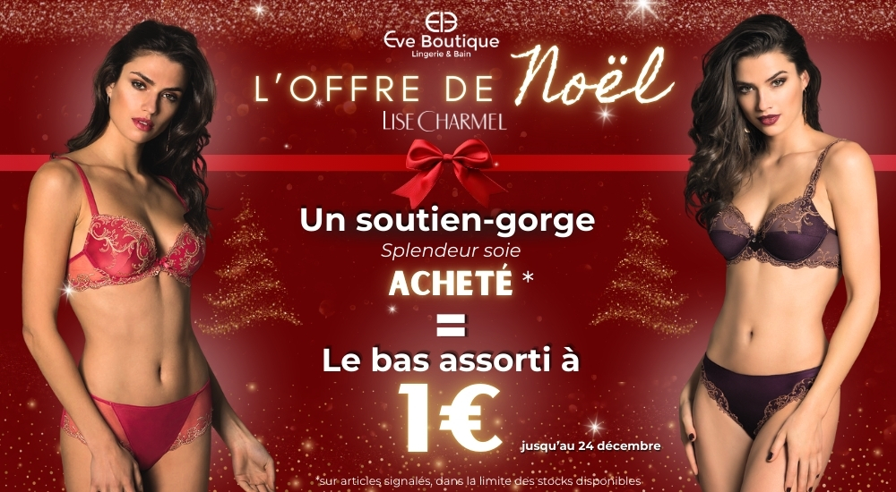 L’offre de Noël : pour l’achat d’un soutien-gorge Splendeur Soie Lise Charmel, le bas assorti vous est offert pour 1€ (jusqu’au 24 décembre).
