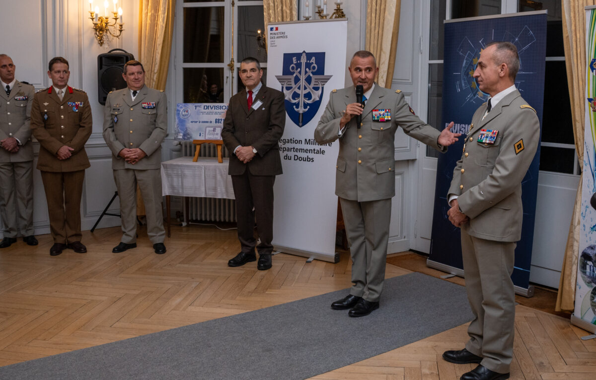 Plus tôt dans la soirée, la 1re Division avait remis un chèque de 6 821,23 € à l’association Terre Fraternité – ADO. Celui-ci a été remis au général de corps d’armée (2S) Éric Margail, président de Terre Fraternité – ADO, lors d’une cérémonie organisée au sein de l’Hôtel de Grand Quartier général de Clévans, à Besançon.