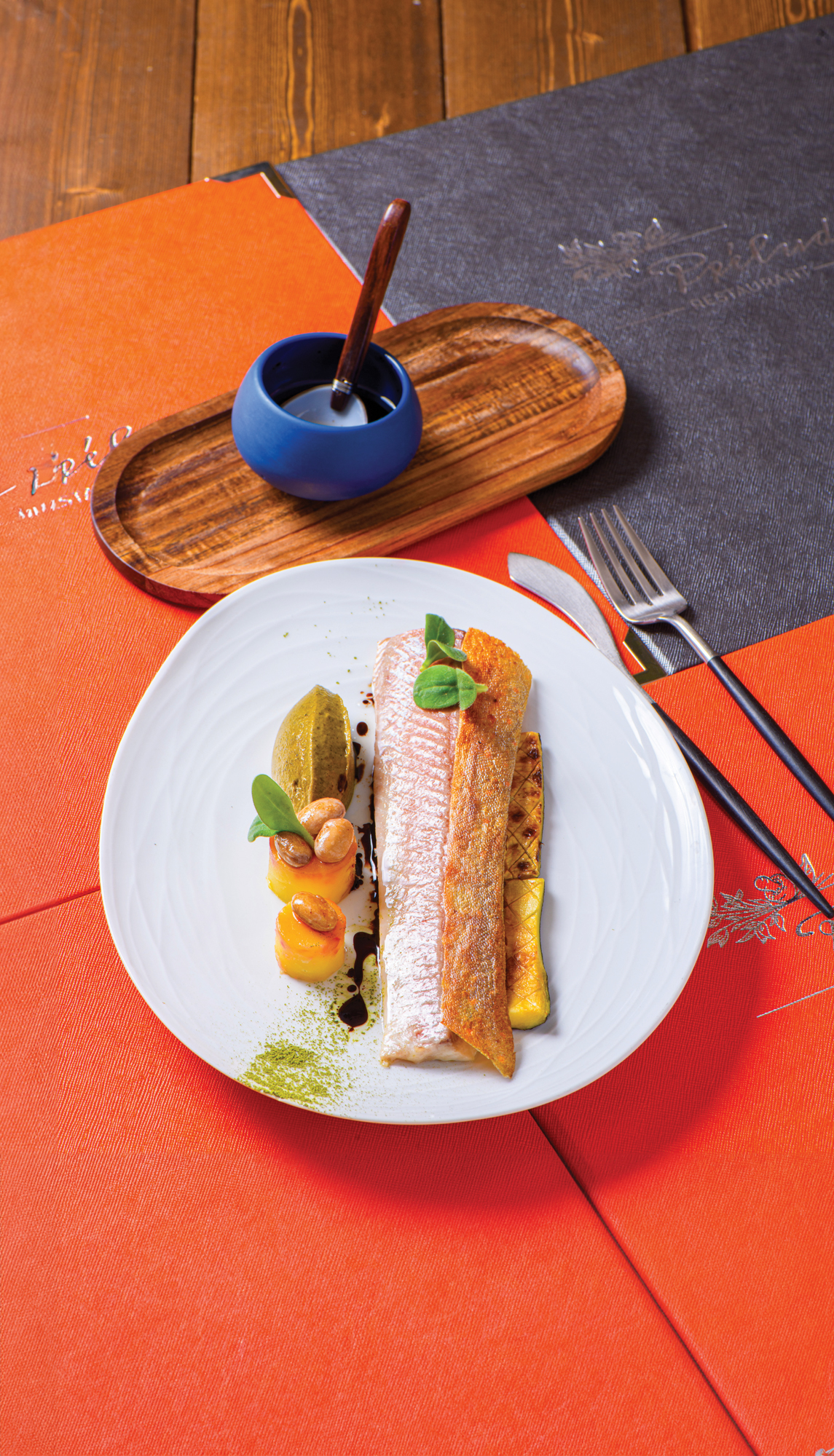 Filet d’omble chevalier rôti au beurre d’échalote, vinaigrette balsamique & absinthe et mousseline de légumes