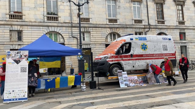 Une ambulance ukrainienne criblée de balles installée place du 8 septembre à Besançon