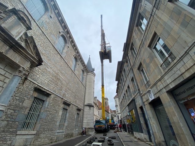 À Besançon, une grue lève une pelleteuse par-dessus un immeuble, à50 mètres du sol