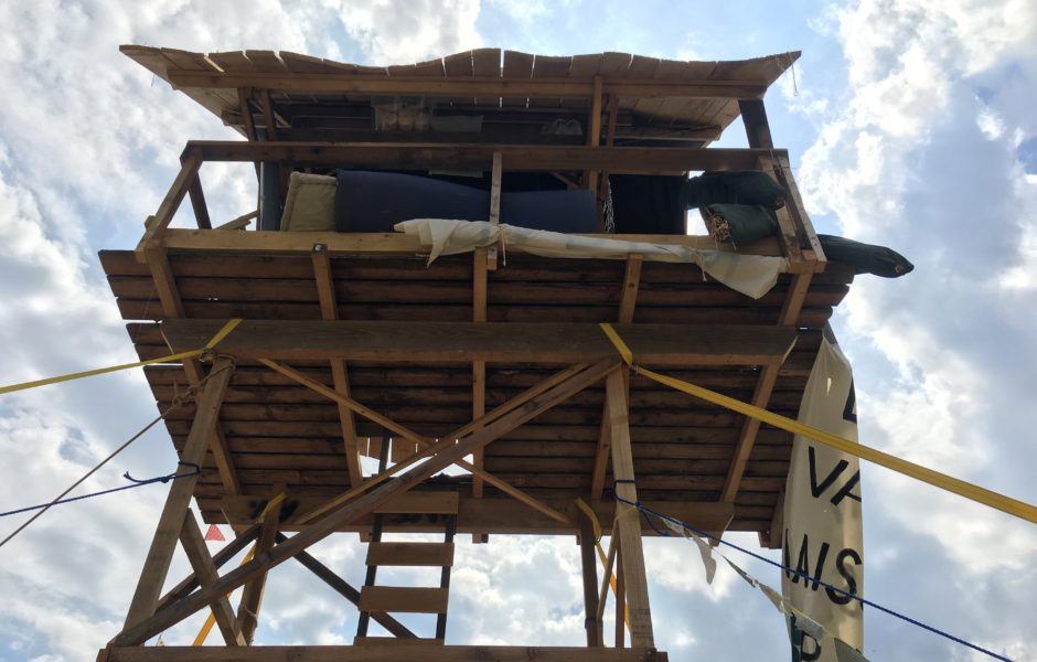 Lancé le 17 juin dernier par ANVCop21 et Extinction Rebellion, le site sur lequel la vigie des Vaîtes a progressivement pris forme. Le collectif (qui compte environ 180 personnes) est établi et s'active sur le site : d'un côté on voit des plantations, d'un autre une cuisine improvisée avec un coin salon et bien sûr une grande table en bois. Des membres s'attèlent au bricolage, fabriquent de la peinture avec des matières naturelles. Ils peindront ensuite des pancartes qui seront exposées à l'entrée du site. Le tout se situe autour de la vigie où une dizaine de personnes "veille" et "monte la garde".