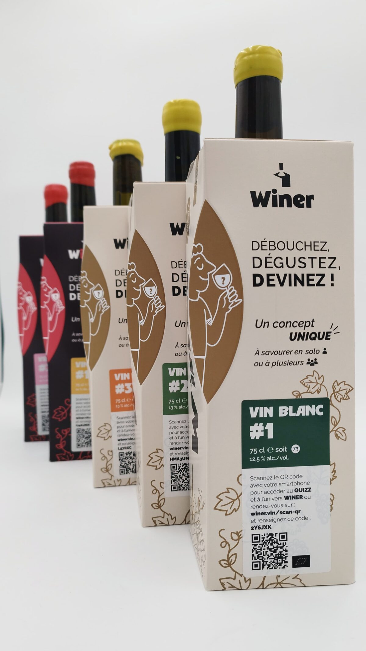 La dégustation peut se faire jusqu’à sept personnes (7 verres) sur une même bouteille. Les coffrets cartonnés sont adaptables jusqu’à sept formats de bouteille différents. Actuellement, Winer propose cinq références possibles (3 blancs, 2 rouges) mais d’ici février dix bouteilles au total seront proposées. Celles-ci sont amenées à être renouvelées régulièrement puisque chaque série ne compte que 1500 bouteilles.